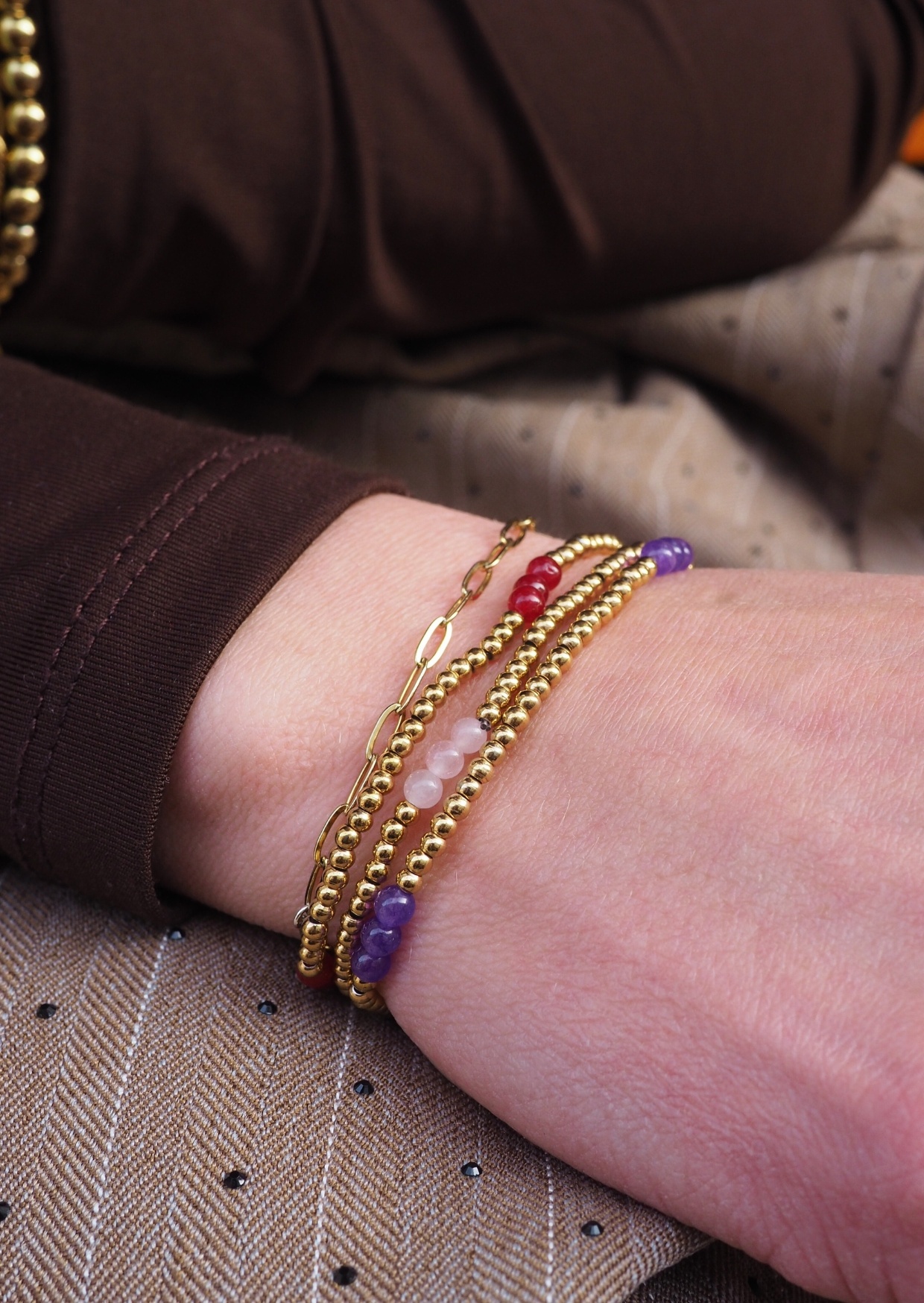Breng warmte in jouw sieraden collectie met deze gouden beads bracelet met carneool. De diepe, rode tint van carneool staat bekend om haar energieke en vrolijke uitstraling, en vormt een prachtig contrast met de glanzende goudkleurige kralen. Elke steen heeft zijn eigen natuurlijke nuances, waardoor jouw armband een uniek en persoonlijk karakter krijgt.