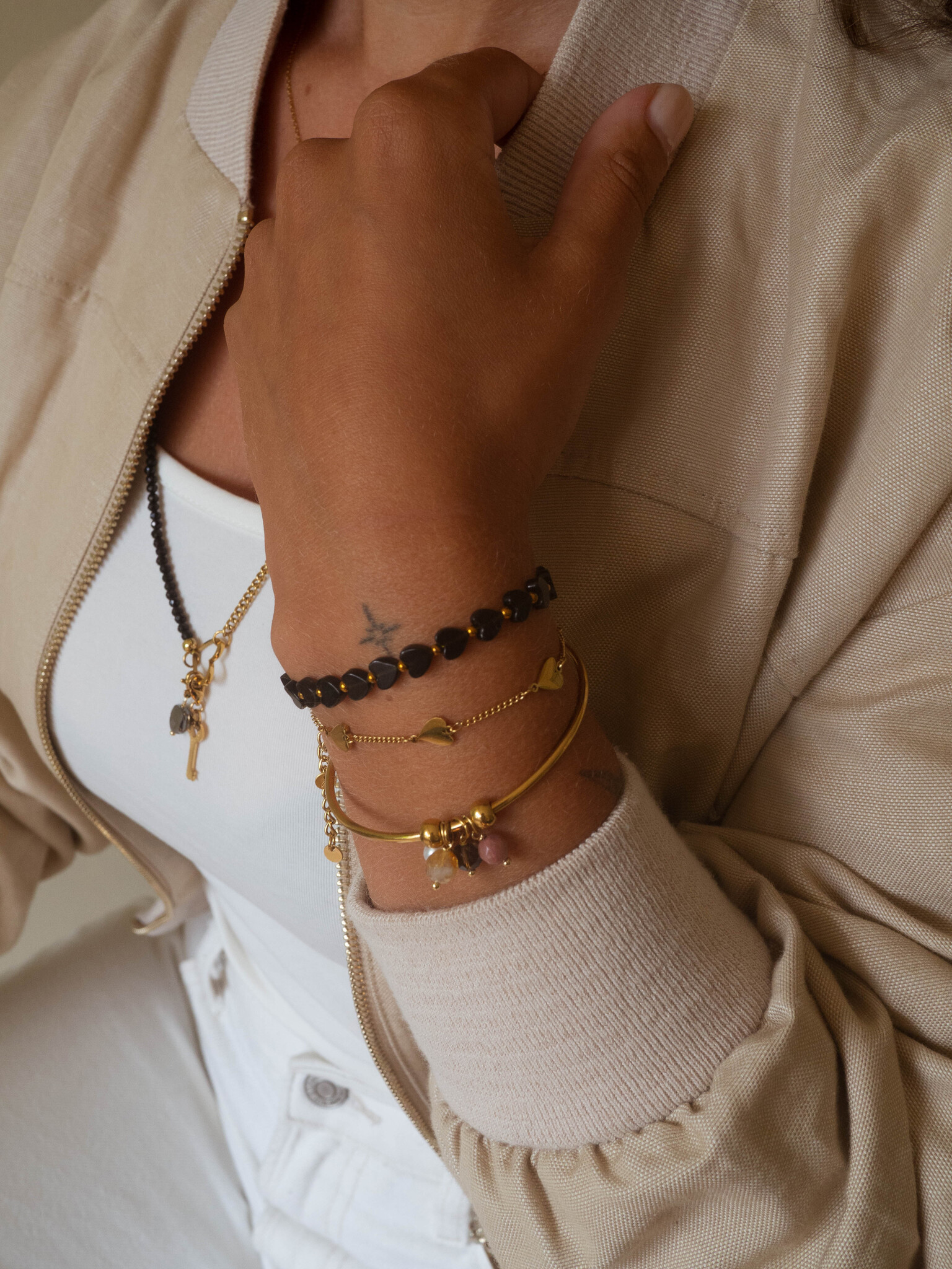 De armband met onyx hartjes is een echte allrounder. De zwarte steentjes geven hem een moderne en stoere uitstraling, terwijl de hartvorm zorgt voor een speels en vrolijk detail. Daardoor past hij eigenlijk overal bij: van je favoriete casual outfit tot een avondlook. Draag hem solo voor een subtiele eyecatcher of mix hem met andere armbanden voor een trendy, gelaagde stijl. Een hip en tijdloos armbandje dat je elke dag kunt dragen zonder dat het verveelt.
