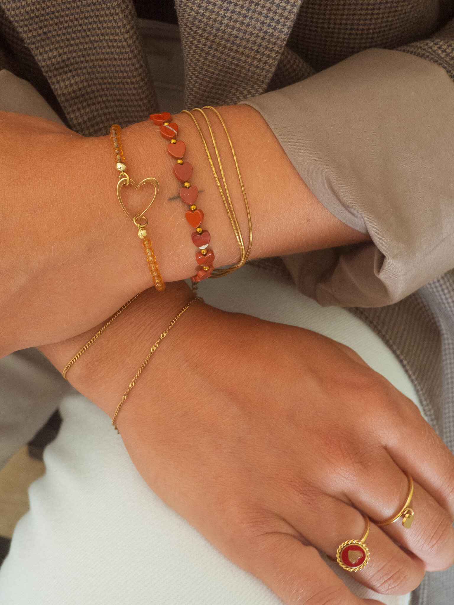 Een verfijnde armband met drie dunne, sierlijke chains die losjes en licht om de pols vallen. De zachte, vloeiende lijnen geven het geheel een minimalistische en elegante uitstraling. Door het delicate ontwerp voelt de armband bijna gewichtloos aan, maar trekt hij toch subtiel de aandacht. Perfect voor iedereen die houdt van tedere details, een rustige stijl en een sieraad dat moeiteloos bij elke outfit past.
