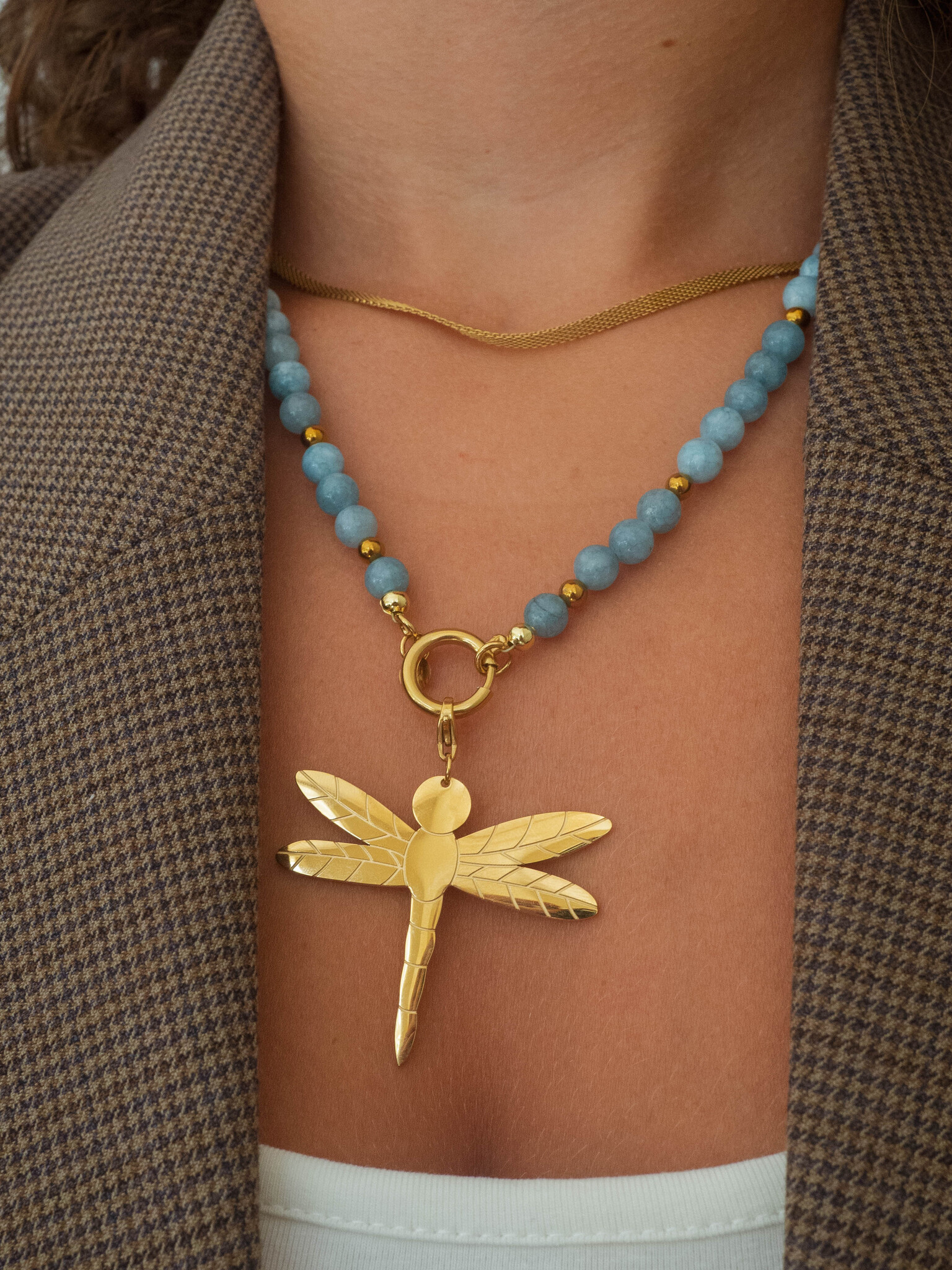 Met deze grote gouden libelle-bedel maak je gegarandeerd een statement. Het robuuste design en royale formaat geven de bedel een bold en edgy karakter, ver weg van verfijnd of subtiel. De libelle staat symbool voor vrijheid en transformatie, maar in dit krachtige ontwerp komt vooral de sterke, eigenzinnige uitstraling naar voren. Perfect om solo te dragen aan een ketting voor maximale impact, of om te mixen met andere statement bedels voor een creatieve en uitgesproken look. Een eyecatcher die lef en persoonlijkheid uitstraalt.