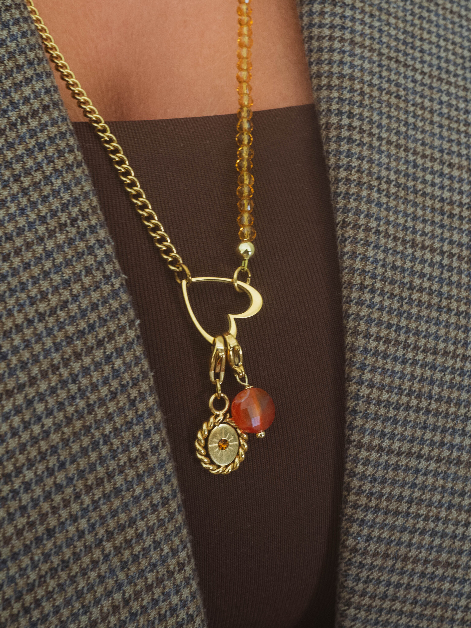 Deze bedel van oranje streepagaat combineert warmte en karakter in één stijlvol sieraad. De platte, ronde vorm blijft tijdloos, terwijl de facet geslepen afwerking het unieke patroon van de steen prachtig benadrukt. Oranje streepagaat staat bekend om energie en vitaliteit te stimuleren, waardoor de bedel niet alleen een mooi detail is, maar ook betekenisvol. Draag hem aan een ketting of armband om je look een natuurlijke, levendige touch te geven. Een veelzijdige bedel die zowel solo als in combinatie met andere sieraden schittert.