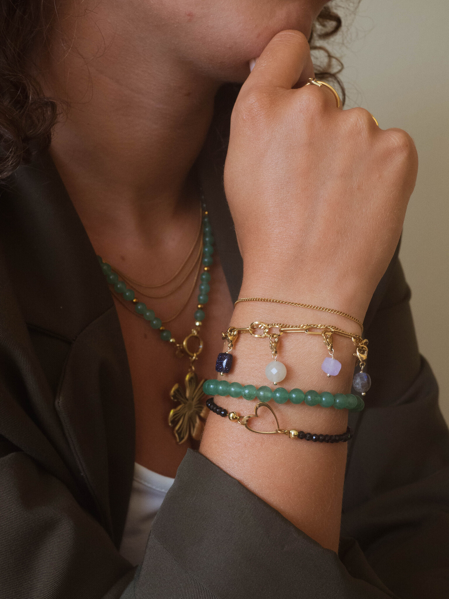 Deze bedel van blauwe goudsteen combineert elegantie met een vleugje magie. Het strakke, vierkante ontwerp geeft een moderne uitstraling, terwijl de subtiele glittertjes in de steen het licht prachtig vangen en een sprankelend effect creëren. Blauwe goudsteen staat bekend om zijn energie, creativiteit en innerlijke rust te bevorderen, waardoor deze bedel zowel stijlvol als betekenisvol is. Draag hem solo als opvallend statement of combineer met andere bedels voor een unieke, persoonlijke look die tijdloos, modern en sprankelend tegelijk is.