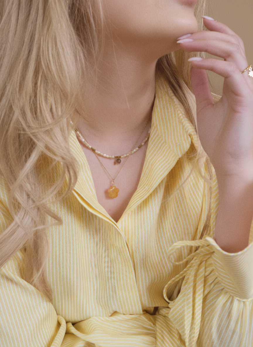 Draag de kracht van de zon altijd bij je Geef je outfit een vrolijke en natuurlijke touch met deze schitterende ketting. Het middelpunt van dit sieraad is een prachtig vormgegeven, grote bloem geslepen uit natuurlijke gele jade. De zonnige, warme kleur van de steen in combinatie met het vrouwelijke bloemdesign maakt dit een uniek sieraad dat direct de aandacht trekt.