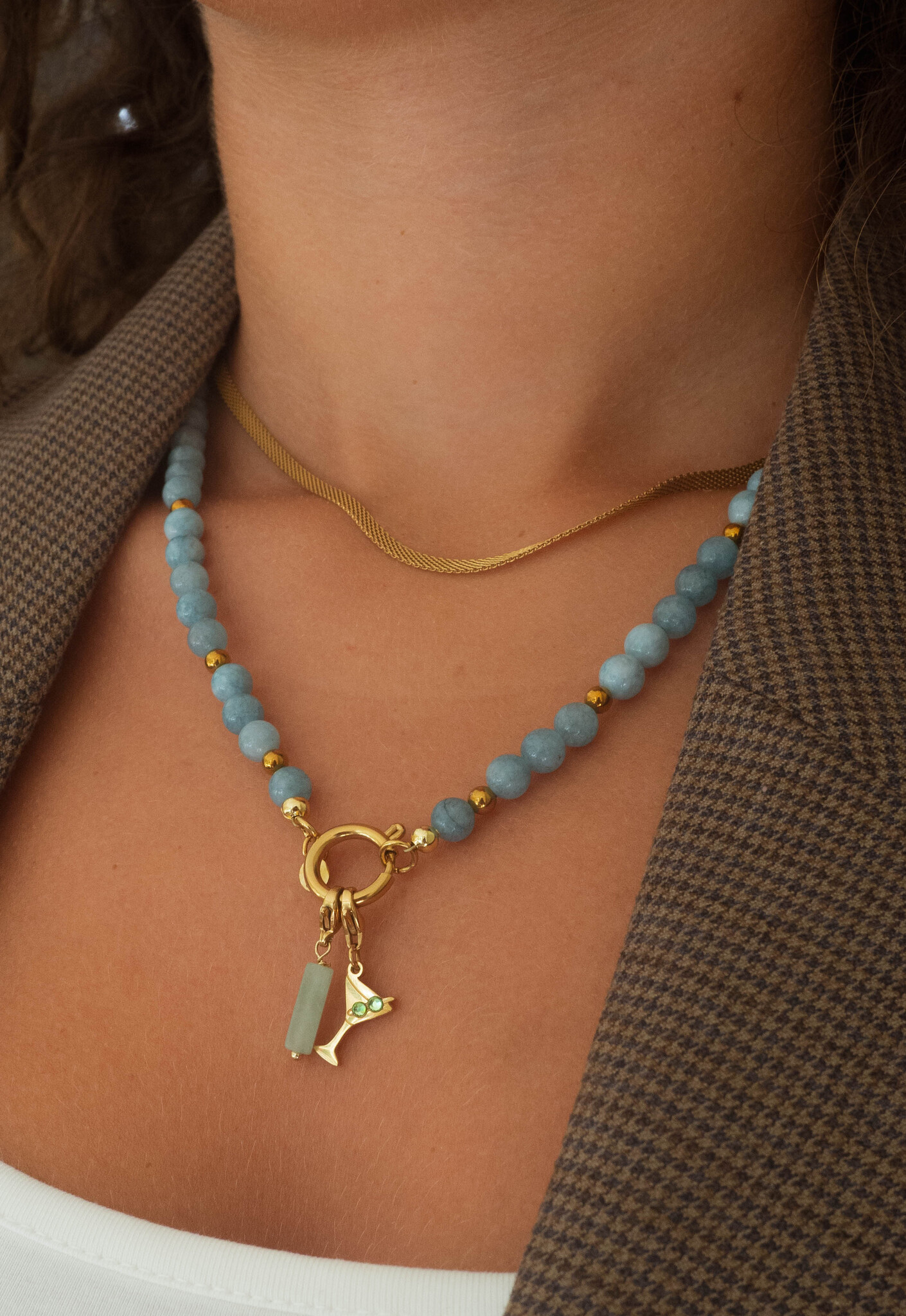 Deze ketting met grote glaskralen in blauwe tinten is een echte eyecatcher. De diepe, rijke kleuren geven je look direct een speelse en elegante uitstraling. Draag hem solo voor een opvallend statement of combineer hem met andere kettingen voor een trendy layered effect.