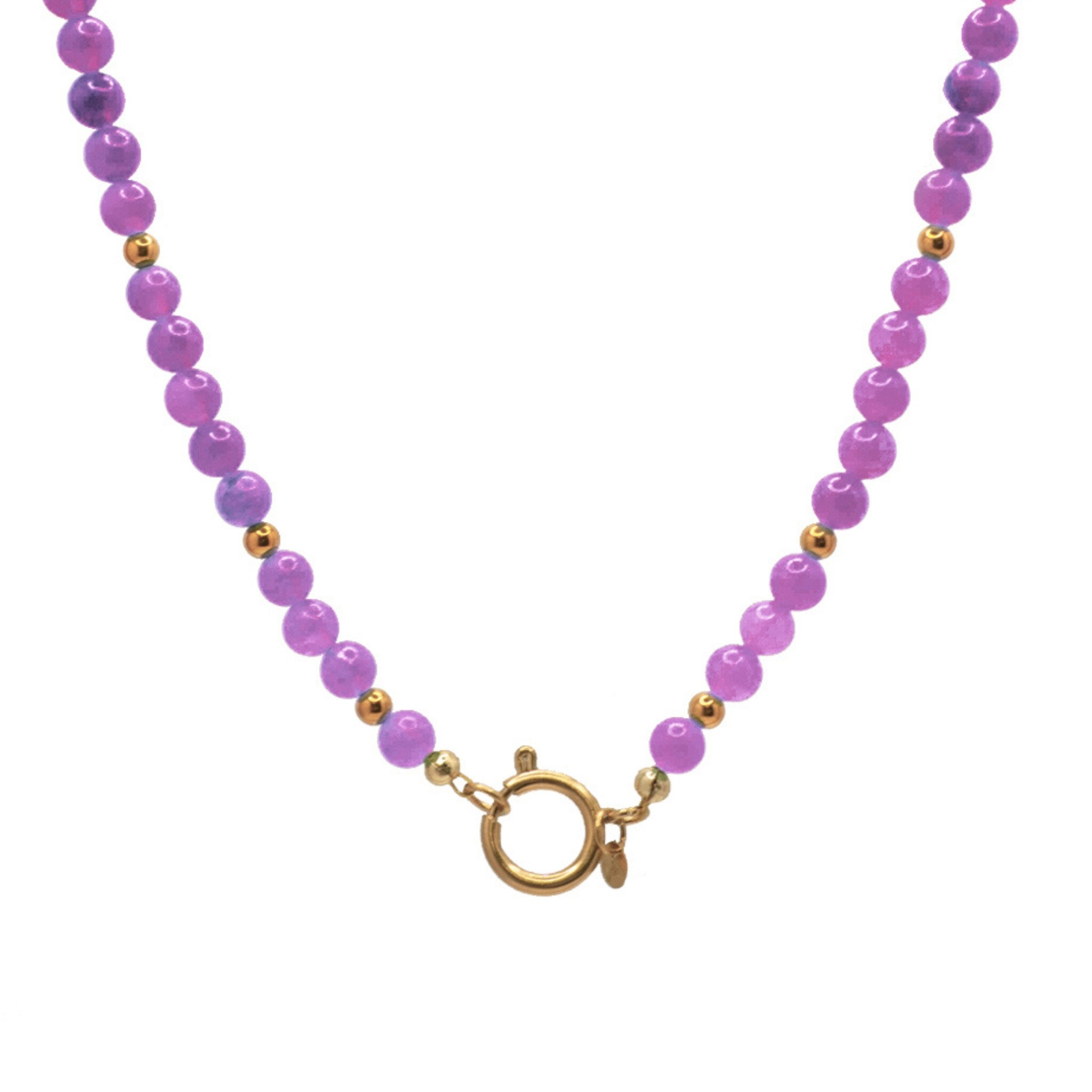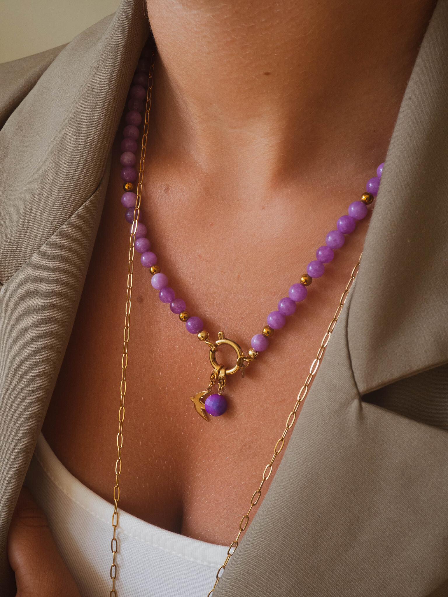 Deze ketting met grote glaskralen in paarse tinten is een echte eyecatcher. De diepe, rijke kleuren geven je look direct een speelse en elegante uitstraling. Draag hem solo voor een opvallend statement of combineer hem met andere kettingen voor een trendy layered effect.