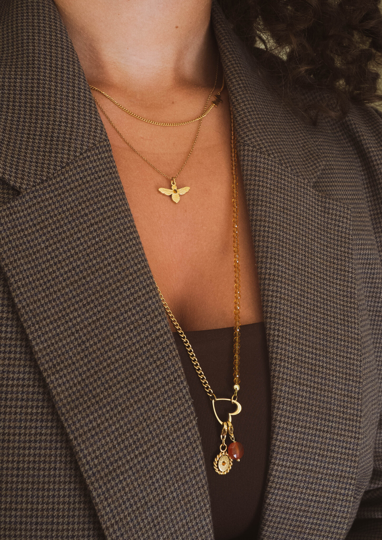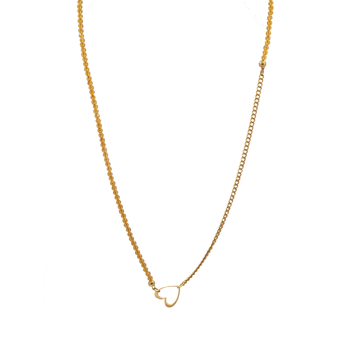 Deze bijzondere ketting combineert glaskralen met de curb schakel, samengebracht door een sierlijk hartje. Voor een persoonlijke touch kun je een bedel aan het hartje hangen, of draag het zonder voor een subtielere look. Het contrast tussen de glanzende kralen en de strakke schakels geeft een speels en elegant effect. Perfect om je outfit extra karakter te geven en eenvoudig te combineren met andere sieraden. Een veelzijdige ketting die zowel casual als chic gedragen kan worden.