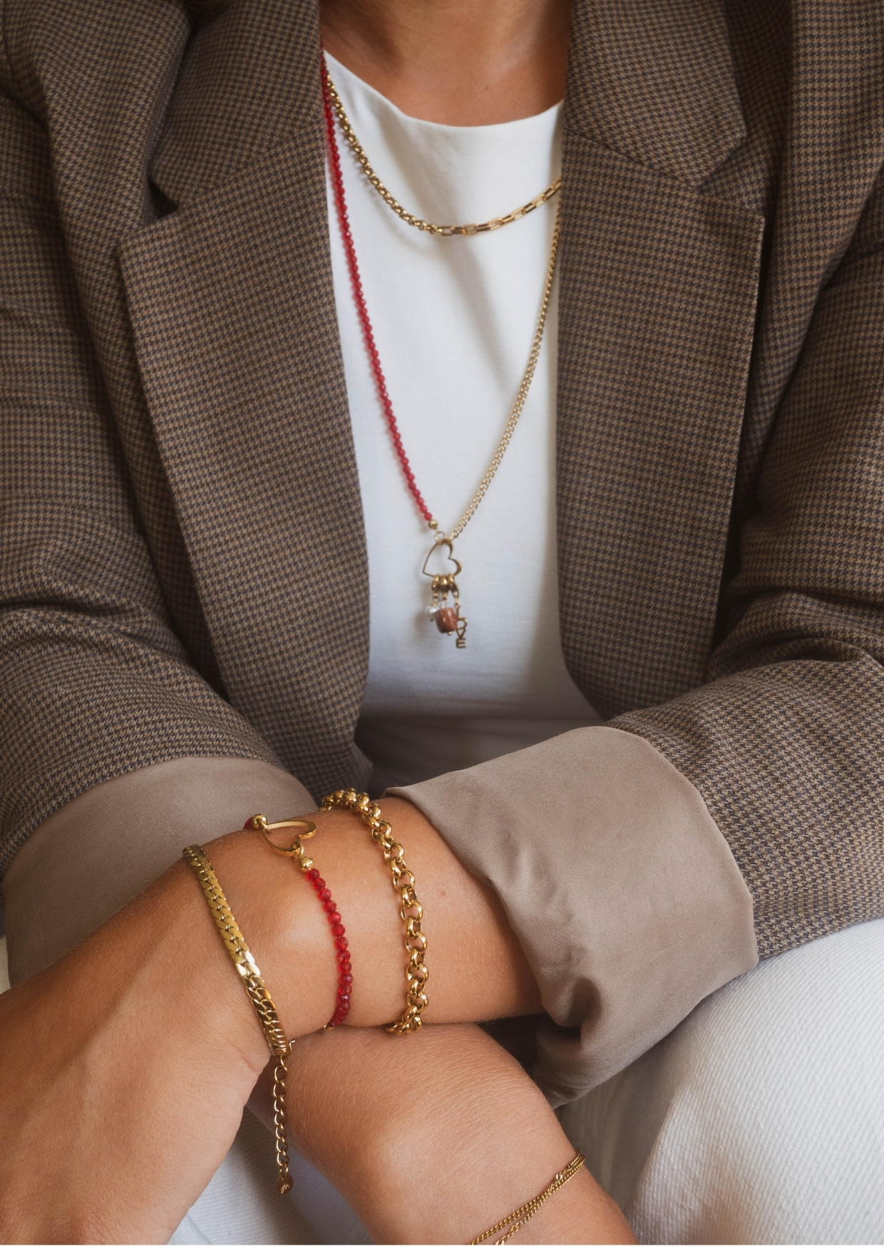 Deze bijzondere ketting combineert glaskralen met de curb schakel, samengebracht door een sierlijk hartje. Voor een persoonlijke touch kun je een bedel aan het hartje hangen, of draag het zonder voor een subtielere look.