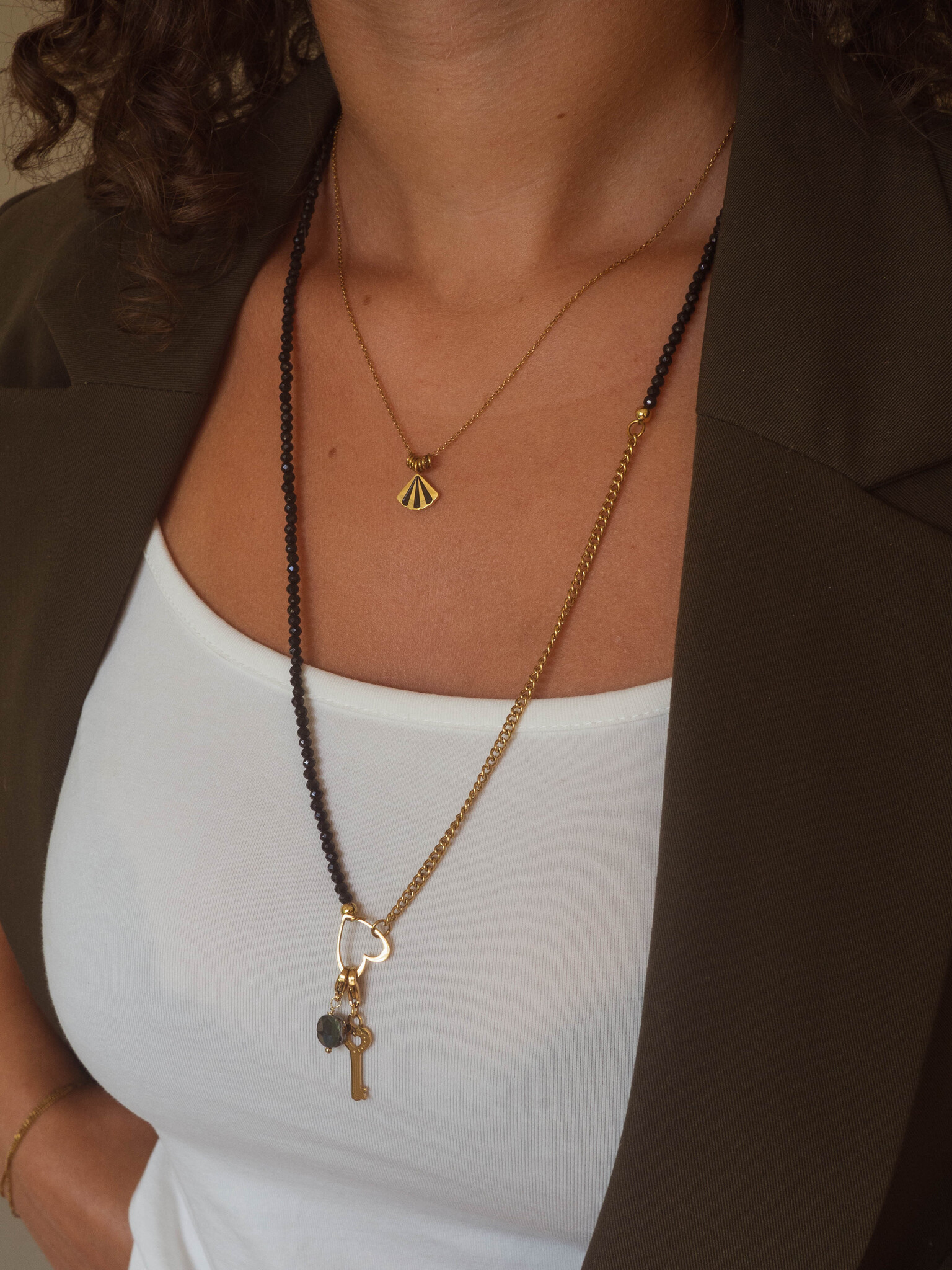 Deze bijzondere ketting combineert glaskralen met de curb schakel, samengebracht door een sierlijk hartje. Voor een persoonlijke touch kun je een bedel aan het hartje hangen, of draag het zonder voor een subtielere look. Het contrast tussen de glanzende kralen en de strakke schakels geeft een speels en elegant effect. Perfect om je outfit extra karakter te geven en eenvoudig te combineren met andere sieraden. Een veelzijdige ketting die zowel casual als chic gedragen kan worden.