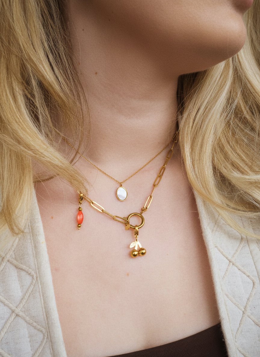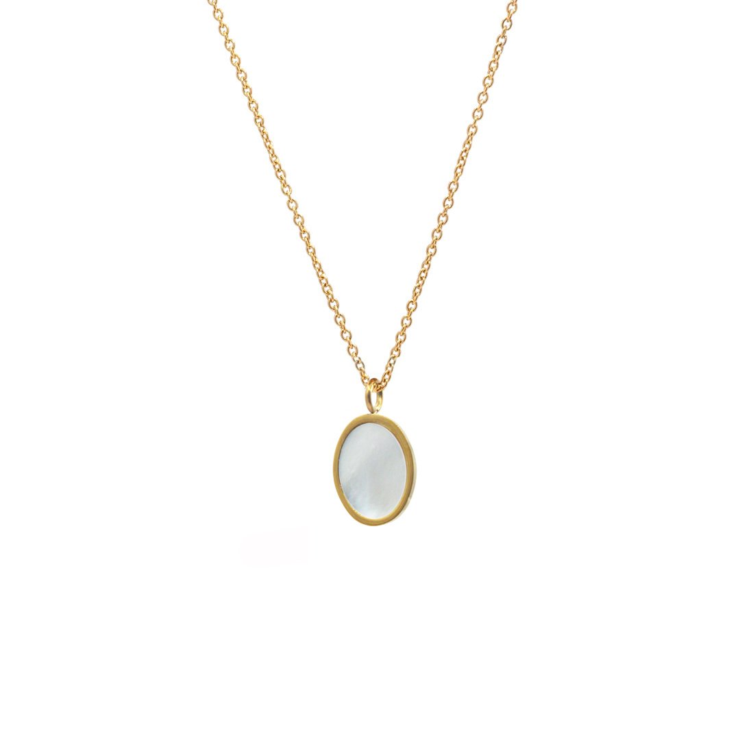 Maak je look compleet met deze elegante ketting, waarin de puurheid van de natuur en moderne luxe samenkomen. De hanger bestaat uit een prachtige ovale schelp, die door zijn natuurlijke glans subtiel het licht vangt. De verfijnde gouden rand vormt een schitterend contrast en geeft het sieraad die extra dosis allure.