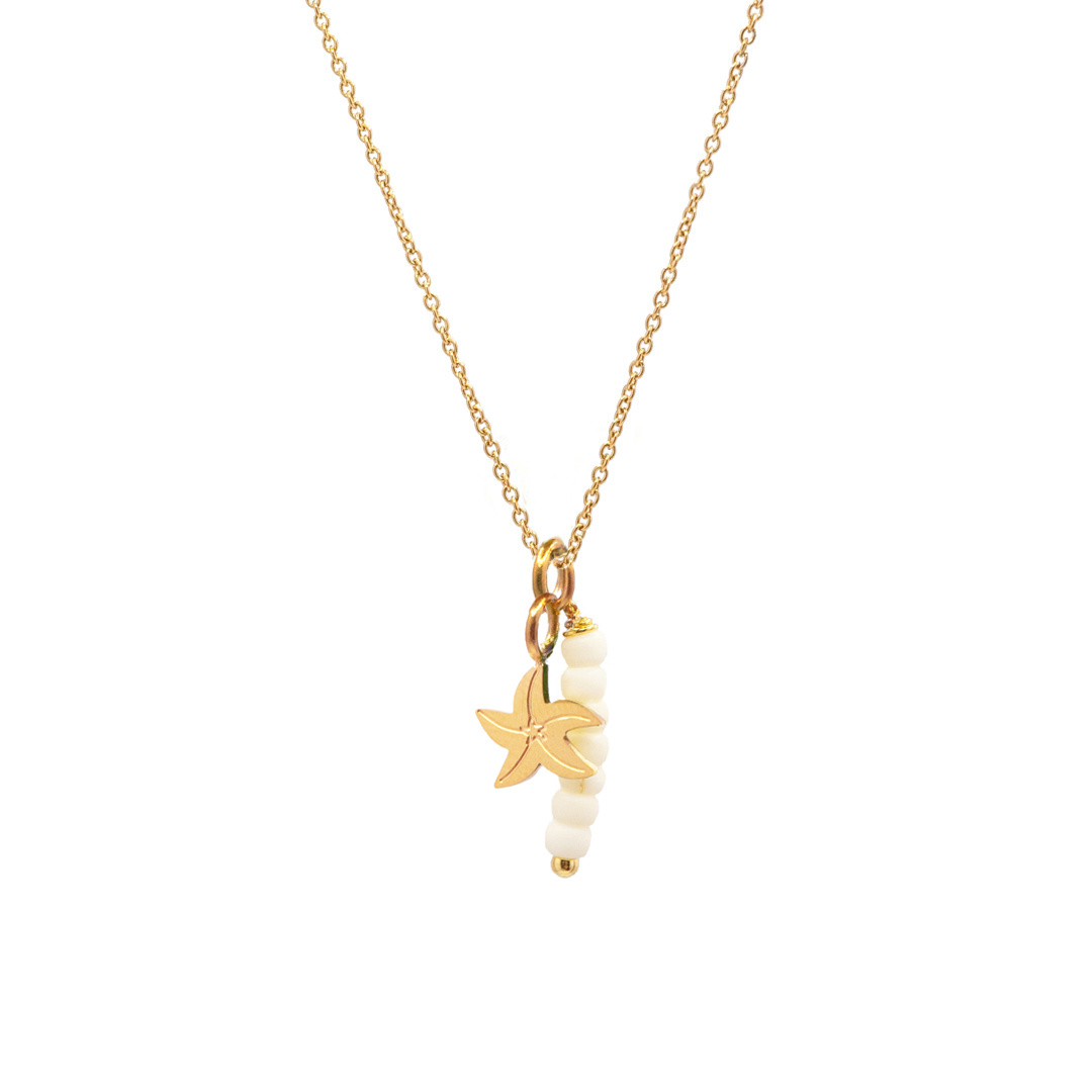 Droom weg naar parelwitte stranden en een helderblauwe zee met onze starfish met witte miyuki kraaltjes. Deze ketting is de ultieme combinatie van een fris, zomers design en een verfijnde afwerking. Het middelpunt van het sieraad is een prachtig gedetailleerde zeester, omringd door de subtiele glans van sneeuwwitte kralen. Deze ketting is te dragen op 40 en 45 cm.