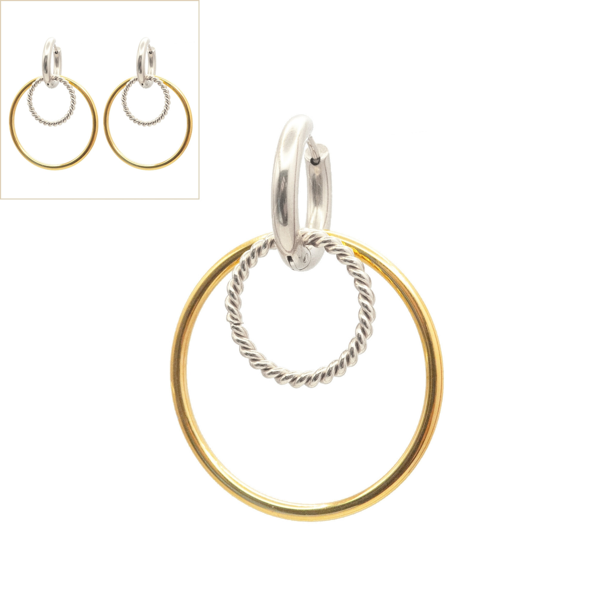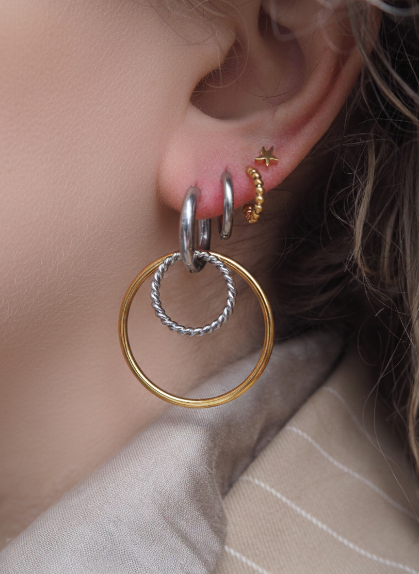 Deze grotere oorbel bestaat uit twee ringen die je los van elkaar kunt dragen. Combineer de ringen samen voor een statement look, draag de oorbel zonder de twisted ring voor een rustige uitstraling of kies alleen de twisted ring voor iets extra’s. Zo wissel je makkelijk tussen verschillende stijlen met één oorbel. Makkelijk te combineren, speels en perfect voor elke dag of een avondlook.