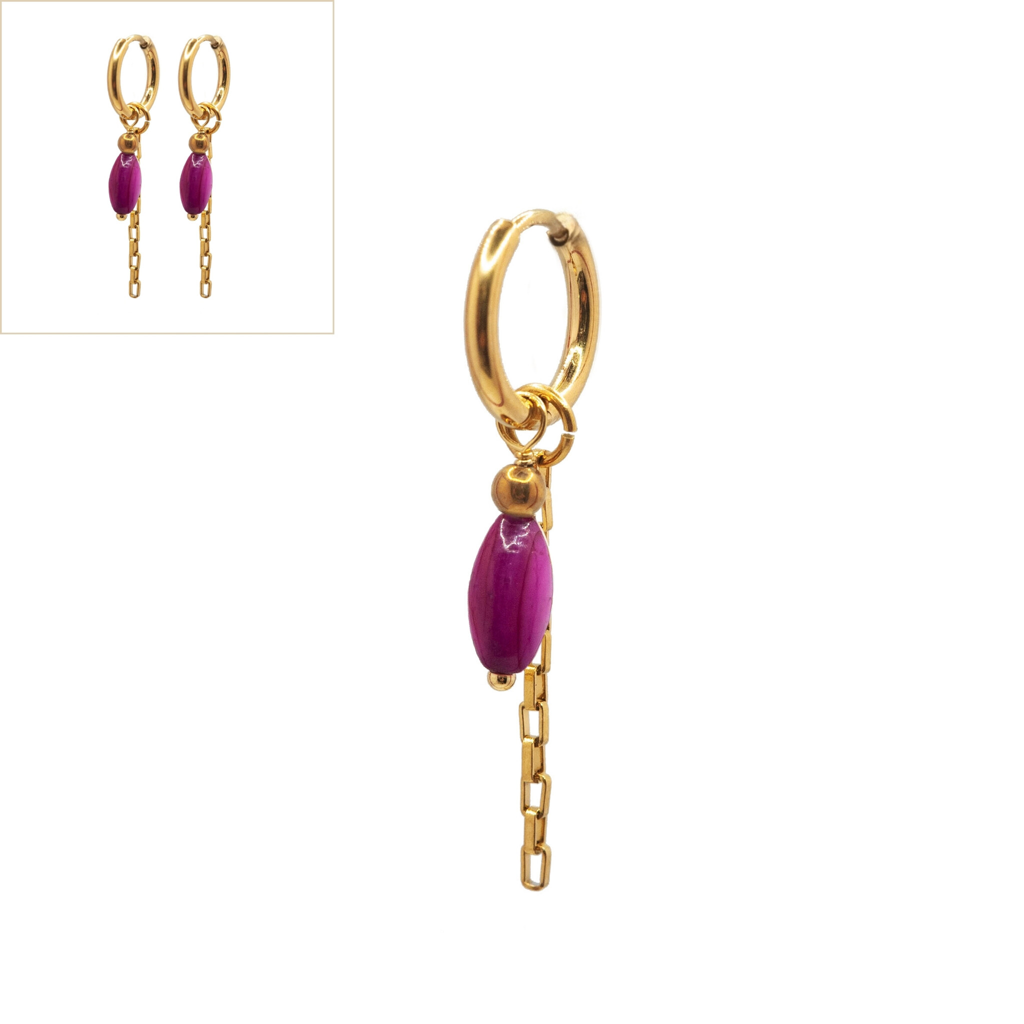 Deze oorbel heeft een ovale schelp kraal met een zachte, glanzende afwerking in verschillende kleuren. Het fijne kettinkje dat eronder hangt zorgt voor beweging en een speels detail. De combinatie van kleur, glans en het slanke ontwerp maakt deze oorbel makkelijk te dragen en leuk om te mixen met andere oorbellen. Een frisse toevoeging aan je sieradencollectie die elke look net iets interessanter maakt. Ga voor een neutrale kleur of maak je look extra opvallend met een van de fellere kleuren!
