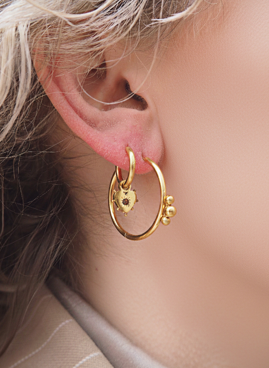 Deze hartjesoorbel combineert een donkerrood zirkonia steentje met een rand van kleine 3D bolletjes voor een speels effect. Het resultaat is een vrolijke, moderne oorbel die makkelijk dagelijks te dragen is en tegelijk net dat beetje extra geeft. Ideaal om te mixen met andere oorbellen of solo te dragen als subtiel statement.