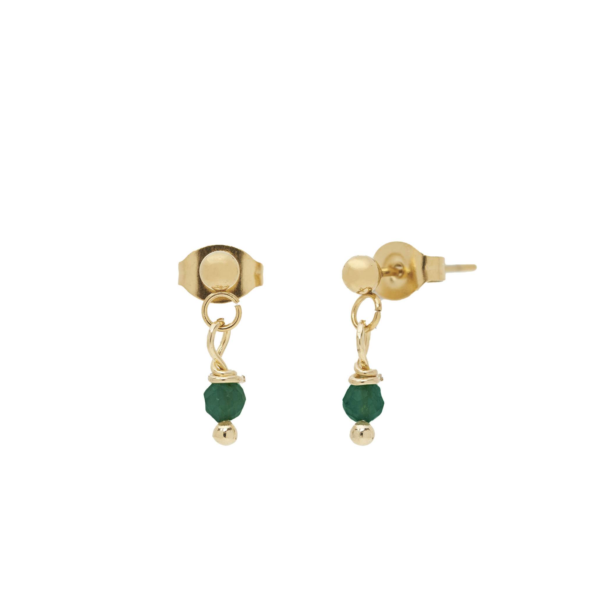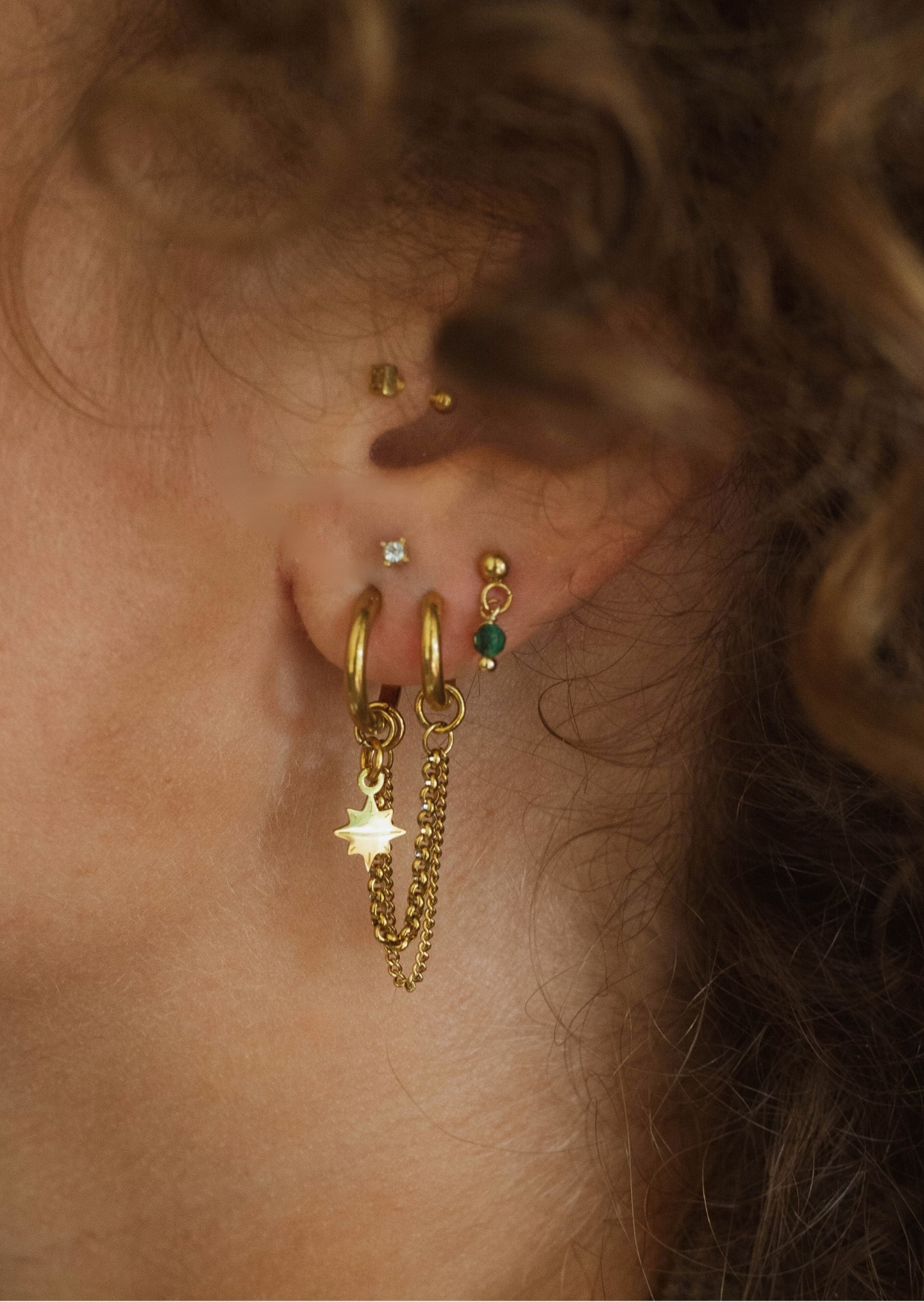 Deze gouden oorknopjes combineren een strak knopje met een bungelend malachiet-steentje dat zachtjes meebeweegt bij iedere beweging. De diepe groene kleur van de steen vormt een mooi contrast met het warme goud en geeft een verfijnde, tijdloze uitstraling. Draag ze solo voor een subtiel statement of combineer met andere oorbellen voor een gelaagde, stijlvolle look. Een elegant sieraad dat iedere outfit een extra touch van karakter en klasse geeft.