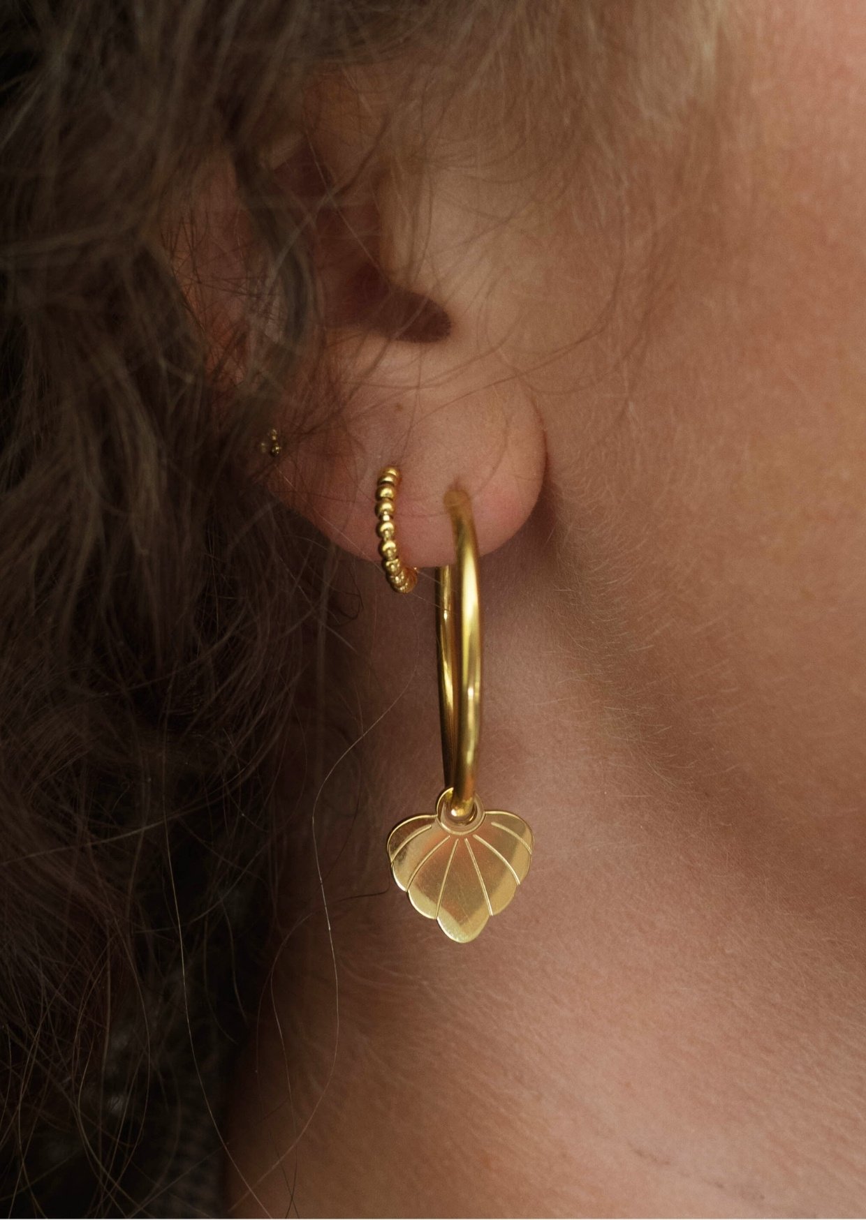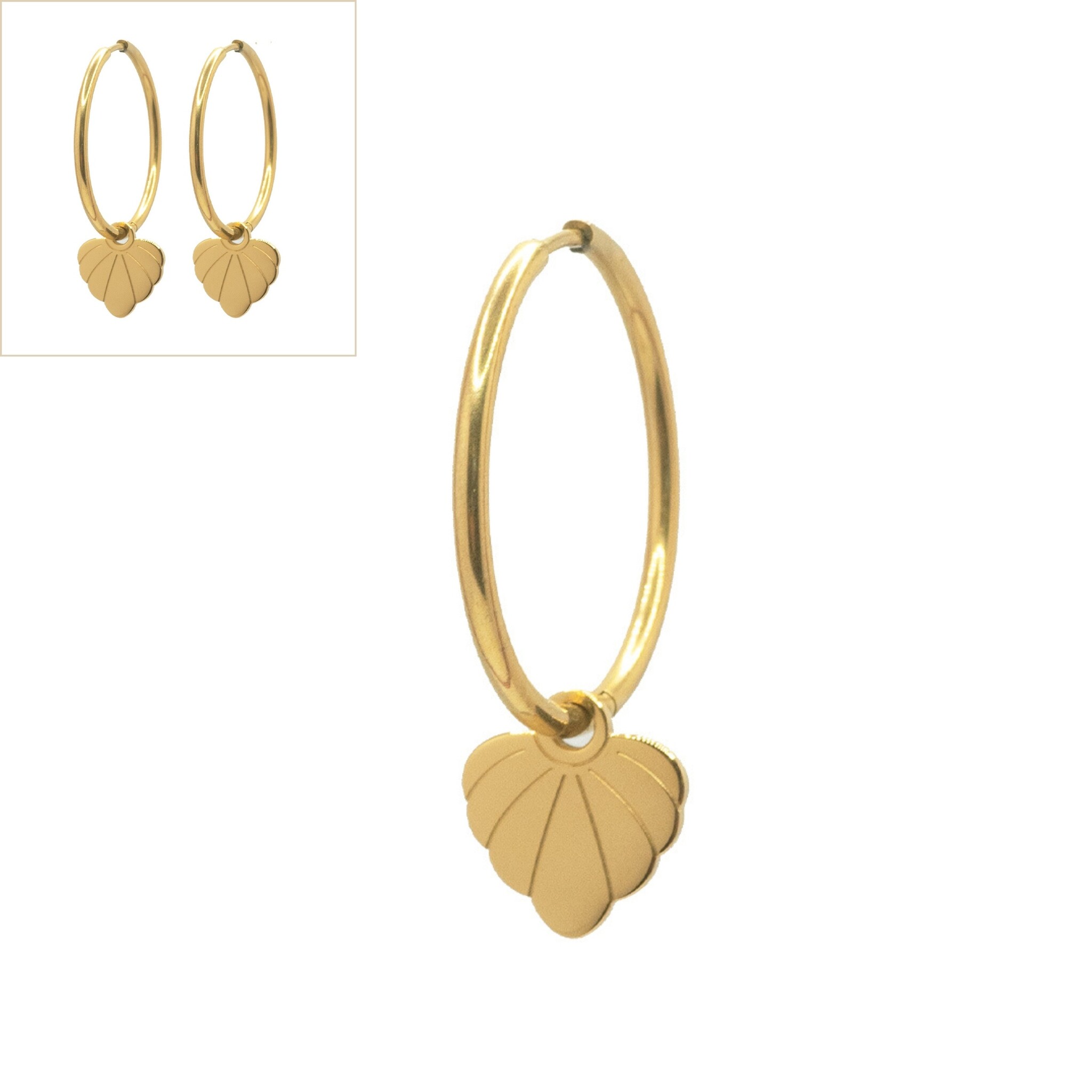Deze oorbellen vallen lekker op zonder too much te zijn. Aan deze gouden creolen hangt een elegante bedel die wat weg heeft van een schelp. Draag deze oorbellen als statement op zichzelf, of combineer ze met kleinere oorbellen voor een gave earparty! Perfect voor elke dag, maar ook stijlvol genoeg voor een avondje uit.