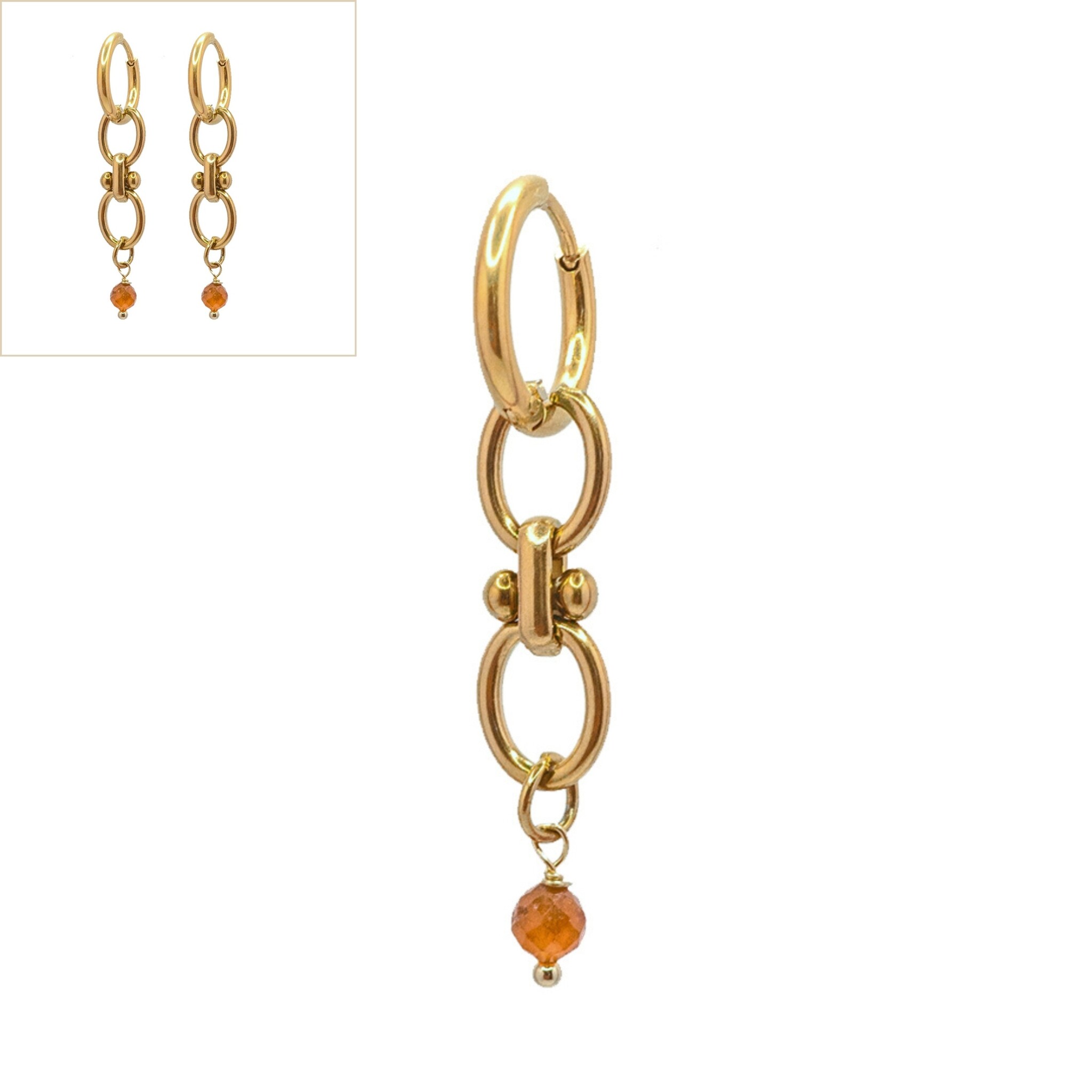 Maak een statement met deze lange oorbellen die bestaan uit twee ovale schakels en een prachtige oranje granaat als afsluiting. De rijke bruine tint van de oranje granaat geeft een natuurlijke en luxe uitstraling, terwijl het design met de schakels zorgt voor een speelse beweging. Perfect om je outfit een verfijnde en unieke touch te geven, zowel casual als chic. Combineer ze met andere sieraden of draag ze solo voor een tijdloze, elegante look.