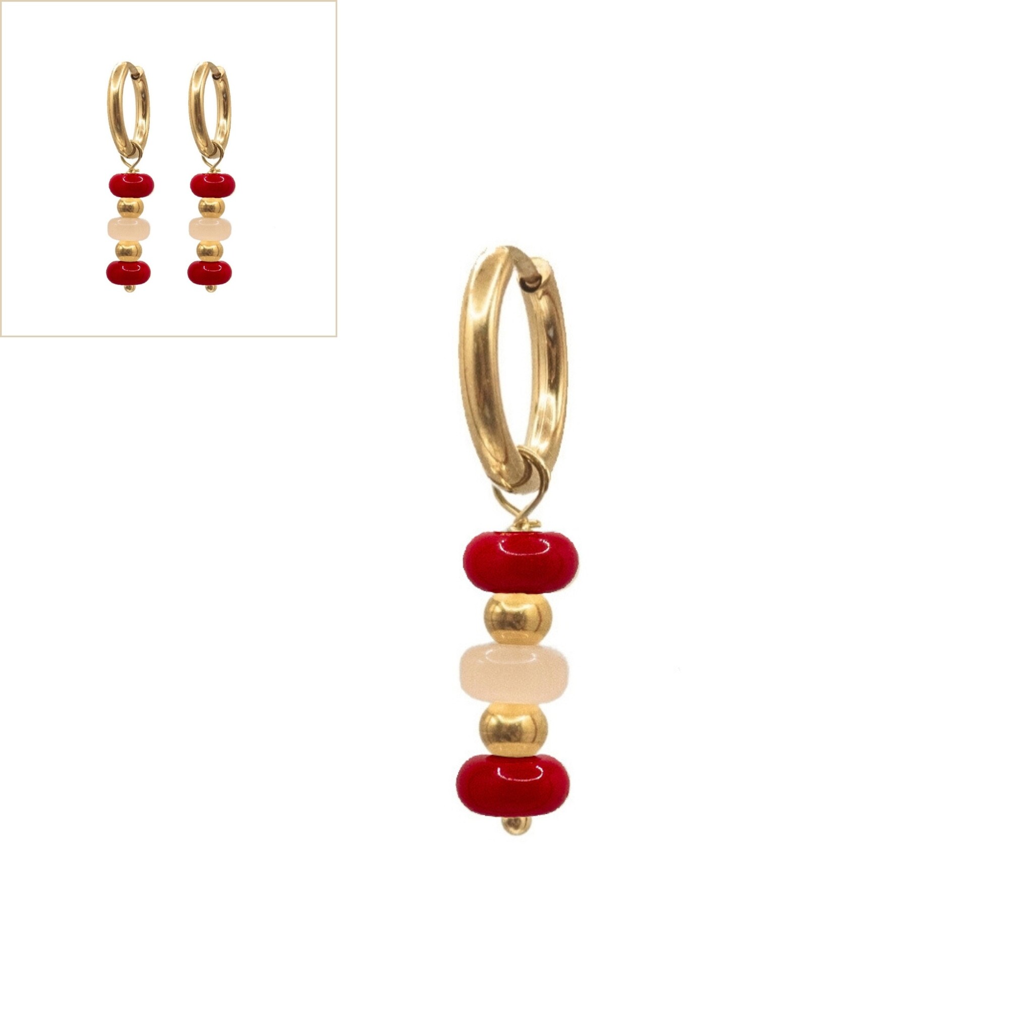Good news: onze bestseller van vorig jaar is terug, en nu in een frisse, nieuwe kleurcombinatie! Deze oorbellen bestaan uit drie ronde kralen op elkaar, met een zachtroze kraal tussen twee rode: een warme, speelse combinatie die direct in het oog springt. Het eenvoudige ontwerp in opvallende kleuren maakt deze oorbel perfect voor wie houdt van kleur zonder poespas. Draag ‘m solo als subtiel statement of combineer met andere oorbellen voor een vrolijke earparty.