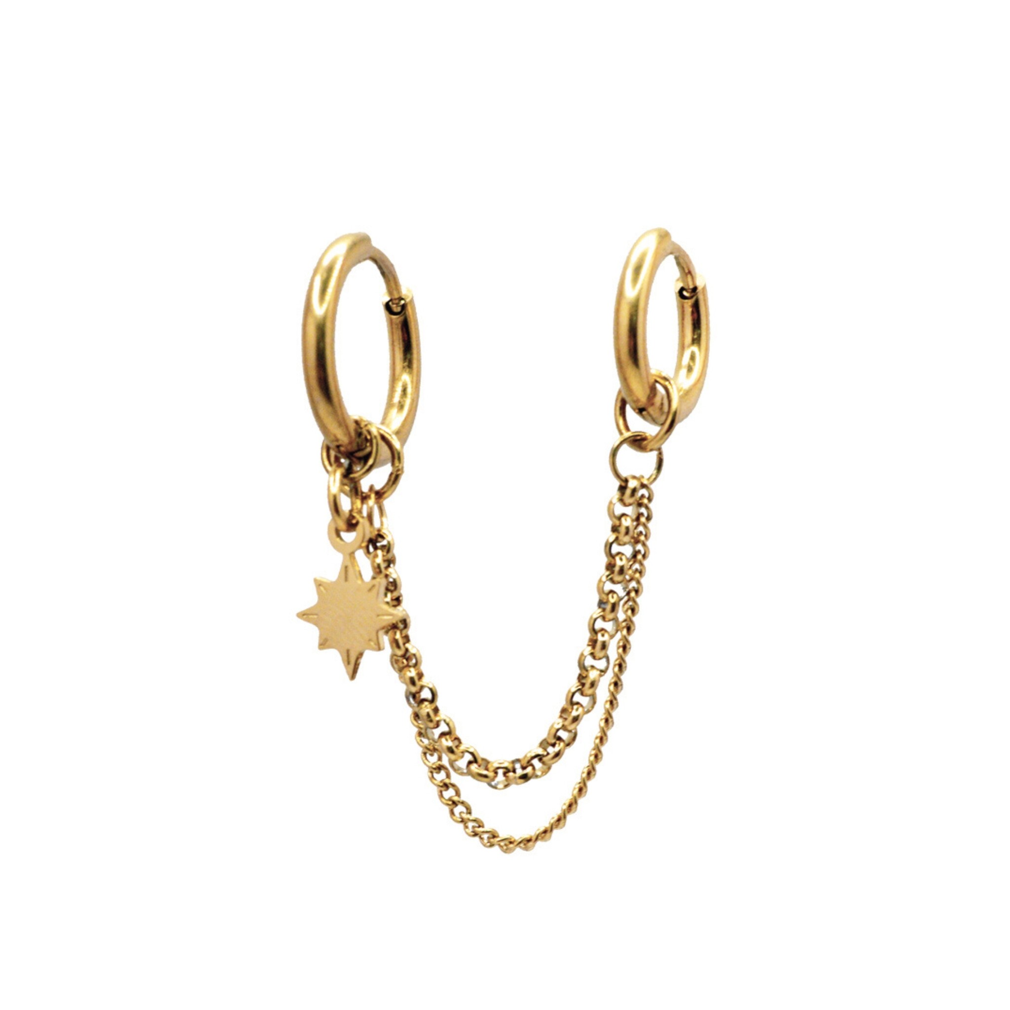 Deze oorbel is speciaal ontworpen voor wie twee gaatjes naast elkaar heeft. Twee fijne creolen worden met elkaar verbonden door een subtiel kettinkje, wat zorgt voor een edgy en elegante look. Aan één van de creolen hangt een klein sterretje als speels detail. Het perfecte sieraad voor wie houdt van net even anders, stijlvol met een twist. Draag ‘m aan 1 kant voor een eigentijdse look!